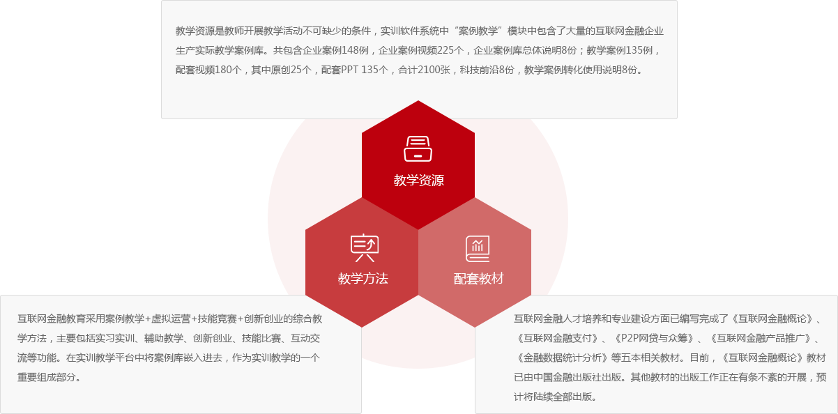 互聯(lián)網(wǎng)金融創(chuàng)新思維教育:通過場景化的情景展示,為學(xué)生提供解決案例問題的真實的職業(yè)環(huán)境,使學(xué)生置身于實踐環(huán)境,將教學(xué)案例歸類至各類崗位需求中,明確提出每個教學(xué)案例需要學(xué)習(xí)的知識點(diǎn)和技能點(diǎn)以及需要達(dá)到的學(xué)習(xí)效果,實現(xiàn)了案例庫直通行業(yè)、直通崗位的功能,體現(xiàn)本案例庫的專業(yè)性。