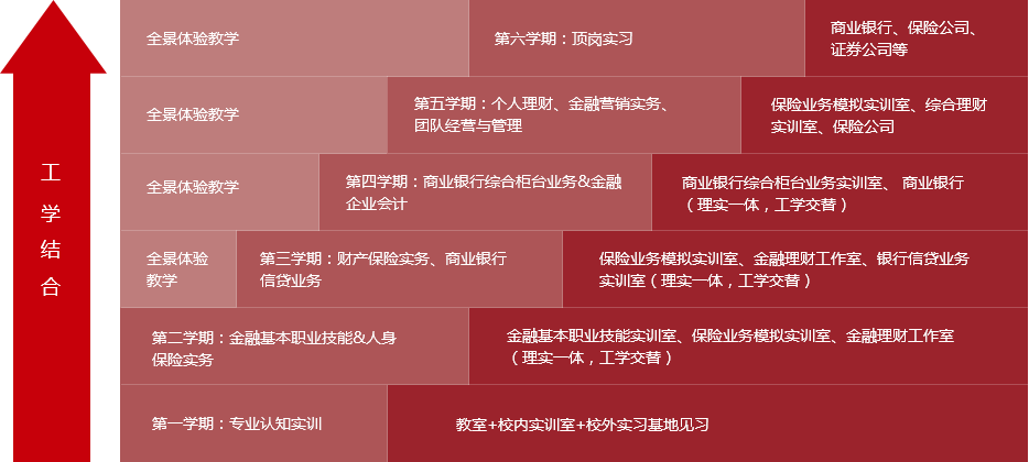 根據(jù)完成金融銀行類相關(guān)崗位工作任務(wù)所需要的職業(yè)能力,構(gòu)建校內(nèi)認(rèn)知實(shí)訓(xùn)、金融基本業(yè)務(wù)技能實(shí)訓(xùn)、理實(shí)一體化課程、工學(xué)交替課程及頂崗實(shí)習(xí)的循序漸進(jìn)實(shí)訓(xùn)實(shí)踐教學(xué)體系。實(shí)踐教學(xué)體系整體設(shè)計(jì)如下圖所示:
