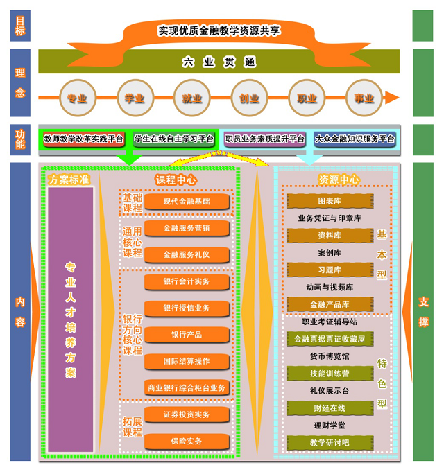金融專業(yè)教學資源庫是2011年教育部立項建設的項目,由高教出版社、中信證券、中國銀行、中國人壽保險公司、浙江金融職業(yè)學院等單位牽頭建設。金融專業(yè)教學資源庫是基于校企合作雙元開發(fā)基礎,融入以學生、職員、教師(培訓師)、大眾居民四方為主體的多元社會需求,通過教師教學改革實踐平臺、學生在線自主學習平臺、職員業(yè)務素質提升平臺、大眾金融知識服務平臺等四大平臺的整體設計,建設滿足金融類高素質技能型專門人才培養(yǎng)需求,體現(xiàn)現(xiàn)代金融業(yè)發(fā)展動態(tài)的優(yōu)質教學資源庫,并成為推動全國高職金融教育教學改革與建設的主要平臺之一。