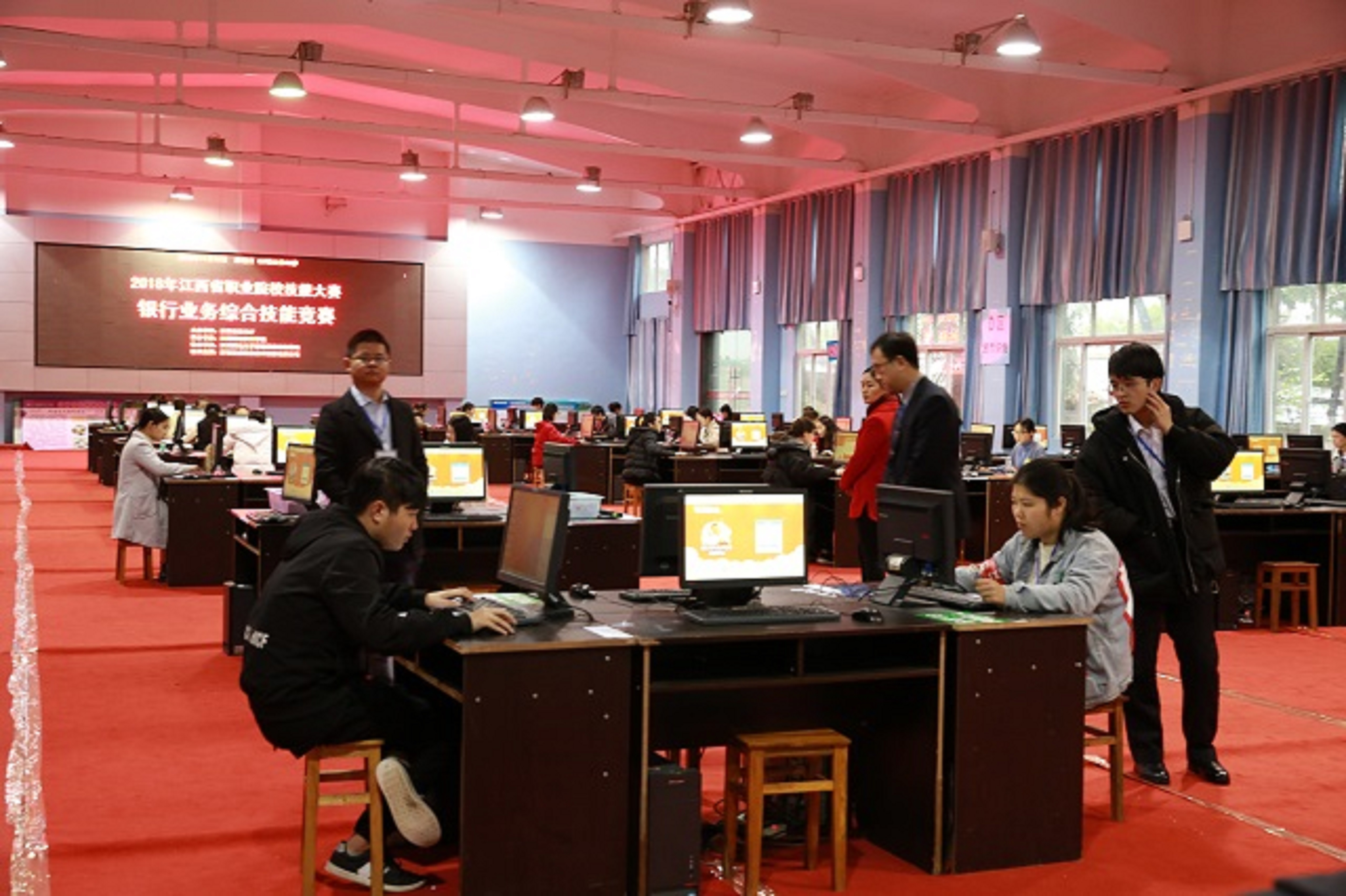 江西財(cái)經(jīng)職業(yè)學(xué)院黨委副書記、常務(wù)副院長何先應(yīng)教授親臨比賽現(xiàn)場指導(dǎo)。(左邊是全國職業(yè)院校銀行業(yè)務(wù)綜合技能競賽賽項(xiàng)裁判鄭興教授,在本次省賽中擔(dān)任裁判長。右邊是財(cái)稅金融學(xué)院樊院長)