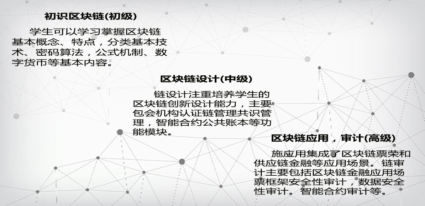 智能升級(jí):學(xué)生用戶分為初級(jí)、中級(jí)、高級(jí)三個(gè)級(jí)別,系統(tǒng)會(huì)根據(jù)對區(qū)塊鏈技術(shù)的掌握情況自動(dòng)升級(jí)用戶級(jí)別,并解鎖相應(yīng)的功能模塊,達(dá)到由低到高,循序漸進(jìn)掌握區(qū)塊鏈技術(shù)。