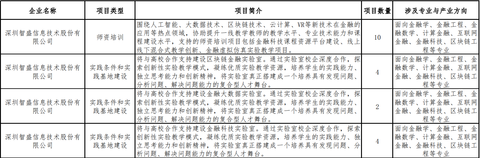 日前,教育部高等教育司發(fā)布了《關(guān)于公布有關(guān)企業(yè)支持的產(chǎn)學(xué)合作協(xié)同育人項(xiàng)目申報(bào)指南(2020年第一批)的通知》,深圳智盛信息技術(shù)股份有限公司申報(bào)的“教學(xué)內(nèi)容和課程體系改革”、“師資培訓(xùn)”、“實(shí)踐條件和實(shí)踐基地建設(shè)”三大類別共計(jì)36個(gè)項(xiàng)目位列其中,成為獲得教育部批準(zhǔn)的產(chǎn)學(xué)合作協(xié)同育人項(xiàng)目實(shí)施企業(yè)之一。