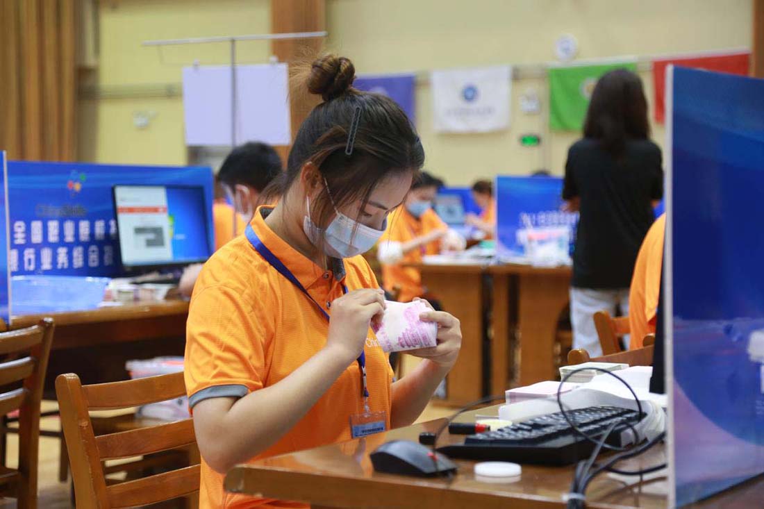 隨著時間的推移,比賽轉(zhuǎn)眼間來到“業(yè)務(wù)技能”賽項,該賽項主要考核選手對金融基本技能的掌握情況,此環(huán)節(jié)由四個單項組成,其中包括:傳票算、字符錄入、手工點鈔、貨幣防偽與鑒別。