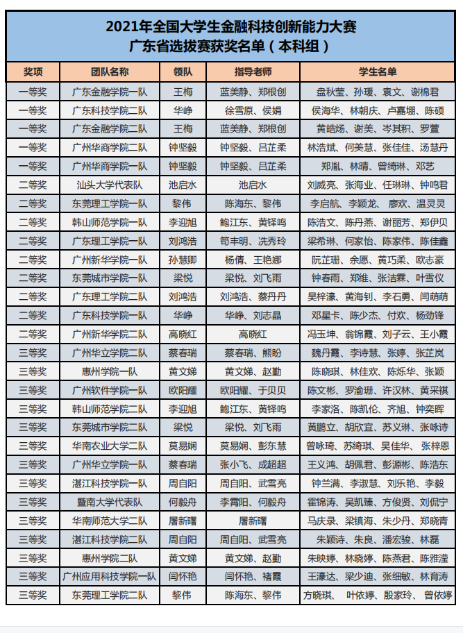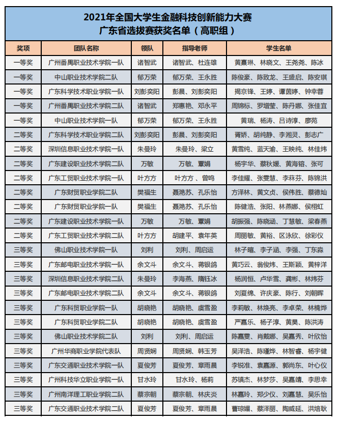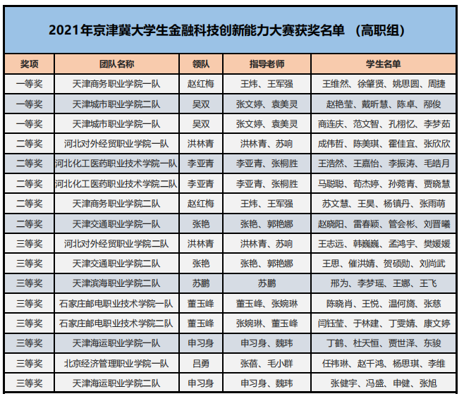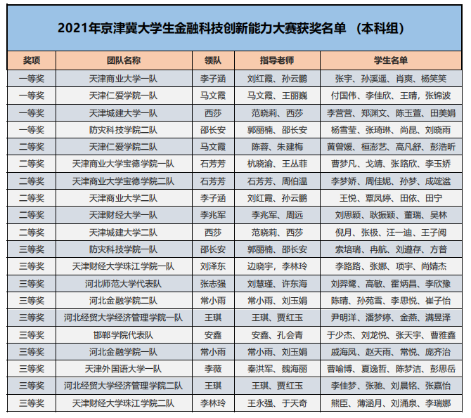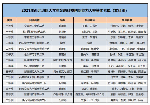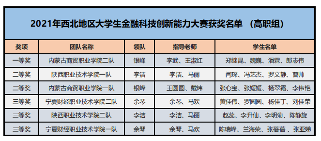 為了培養(yǎng)新一代青年大學(xué)生的金融科技創(chuàng)新能力,鼓勵對金融類專業(yè)人才創(chuàng)新意識和創(chuàng)新素質(zhì)的培養(yǎng)與訓(xùn)練,推進(jìn)本科與高職金融類專業(yè)“教、學(xué)、考、做、賽”五位一體的教學(xué)改革,推進(jìn)金融科技教育“工學(xué)結(jié)合、學(xué)做合一”;同時也是為適應(yīng)金融科技行業(yè)的蓬勃發(fā)展,對接金融科技企業(yè)人才需求,全面提升金融科技人才培養(yǎng),鼓勵創(chuàng)新意識、深化創(chuàng)新層次、激勵創(chuàng)新人才。在高等學(xué)校國家級實(shí)驗(yàn)教學(xué)示范中心聯(lián)席會經(jīng)濟(jì)與管理學(xué)科組的指導(dǎo)下,2021年“智盛杯”各省市地區(qū)大學(xué)生金融科技創(chuàng)新能力大賽已成功舉辦。根據(jù)活動方案規(guī)定的獲獎比例,現(xiàn)將各地區(qū)賽的獲獎名單予以公布。