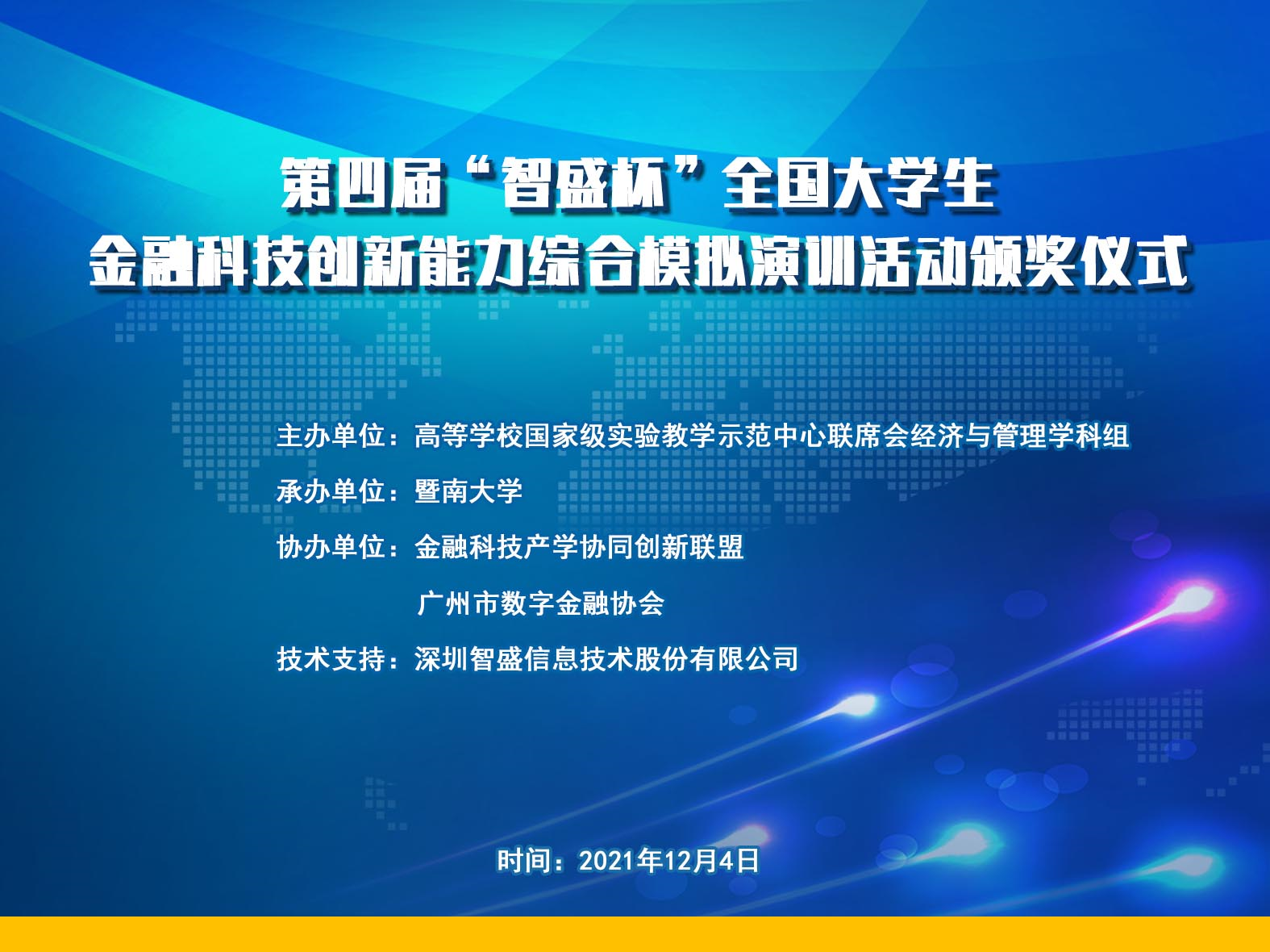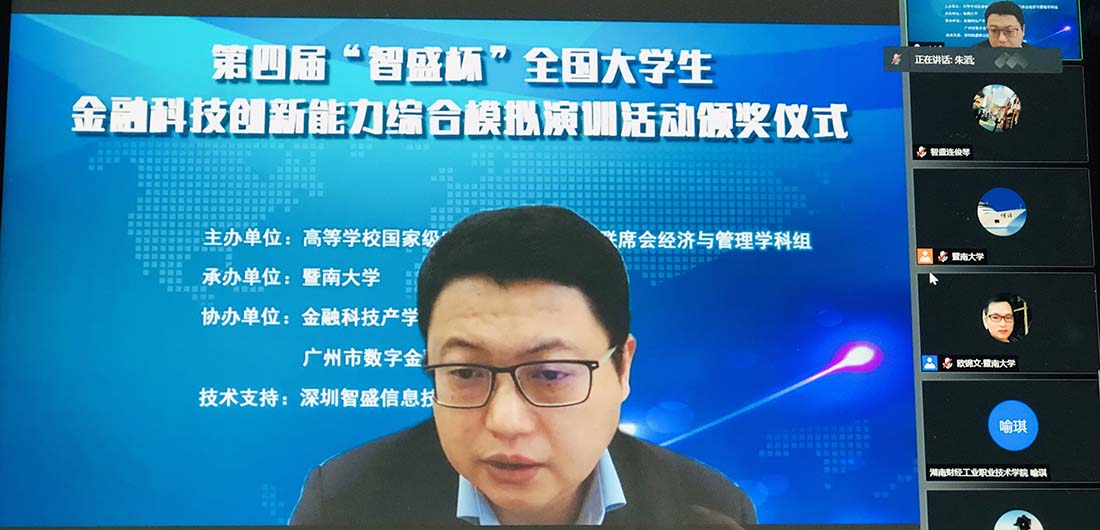 2021年12月4日,由高等學校國家級實驗教學示范中心聯(lián)席會經(jīng)濟與管理學科組主辦;暨南大學承辦;金融科技產(chǎn)學協(xié)同創(chuàng)新聯(lián)盟和廣州市數(shù)字金融協(xié)會協(xié)辦;深圳智盛信息技術股份有限公司作為技術支持的第四屆“智盛杯”全國大學生金融科技創(chuàng)新能力大賽頒獎儀式正式收官。此次頒獎儀式采取線上方式通過以騰訊會議直播的形式參加。