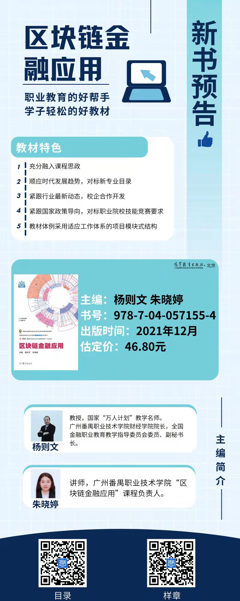 本教材是由國家“萬人計劃”教學名師楊則文教授帶隊、校企合作編寫的項目式立體化教材《區(qū)塊鏈金融應用》。由高等教育出版社出版發(fā)行,是高等職業(yè)教育財經(jīng)類專業(yè)群數(shù)智化財經(jīng)系列教材;也是高等職業(yè)教育金融類專業(yè)“崗課賽訓”融通系列教材,并將于近期上市發(fā)行。