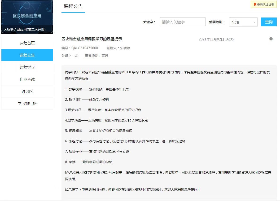 為落實中央部署,教育部于2020年4月30日發(fā)布《高等學校區(qū)塊鏈技術創(chuàng)新行動計劃》(以下簡稱《行動計劃》),文件要求“到2025年,在高校布局建設一批區(qū)塊鏈技術創(chuàng)新基地,培養(yǎng)匯聚一批區(qū)塊鏈技術攻關團隊,基本形成全面推進、重點布局、特色發(fā)展的總體格局和高水平創(chuàng)新人才不斷涌現(xiàn)。高質(zhì)量科技成果持續(xù)產(chǎn)生的良好態(tài)勢,推動若干高校成為我國區(qū)塊鏈技術創(chuàng)新的重要陣地,一大批高校區(qū)塊鏈技術成果為產(chǎn)業(yè)發(fā)展提供動能,有力支撐我國區(qū)塊鏈技術的發(fā)展、應用和管理。文件同時提出“針對區(qū)塊鏈在金融服務領域應用的需求和問題,建設基于區(qū)塊鏈的金融服務技術與應用創(chuàng)新平臺,支撐開展區(qū)塊鏈在數(shù)字貨幣、跨境支付/結算、供應鏈金融、資產(chǎn)證券化等金融業(yè)務的創(chuàng)新應用研究;支撐開展面向金融監(jiān)管領域需求的區(qū)塊鏈關鍵技術應用研究,提升我國防范和化解金融風險的能力,助力國家金融安全,提升我國的金融科技創(chuàng)新能力和應用水平,推動我國數(shù)字金融發(fā)展和人民幣國際化",這一系列講話和文件明確了學校開展區(qū)塊鏈技術應用研究和開設區(qū)塊鏈技術課程的重要性和必要性,為區(qū)塊鏈金融應用進入課堂提供了強大的政策推動力。