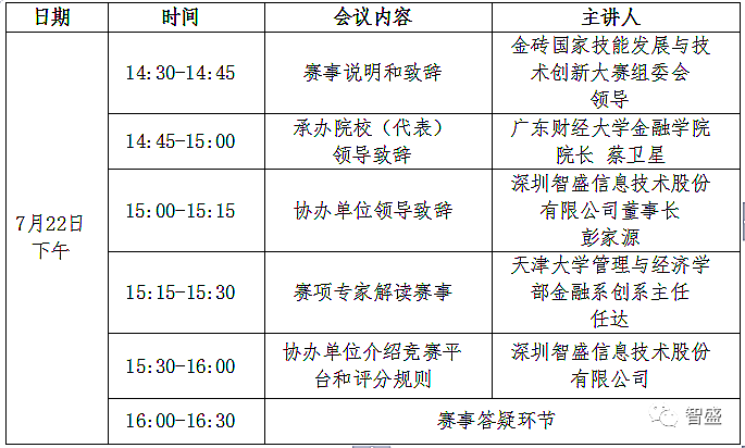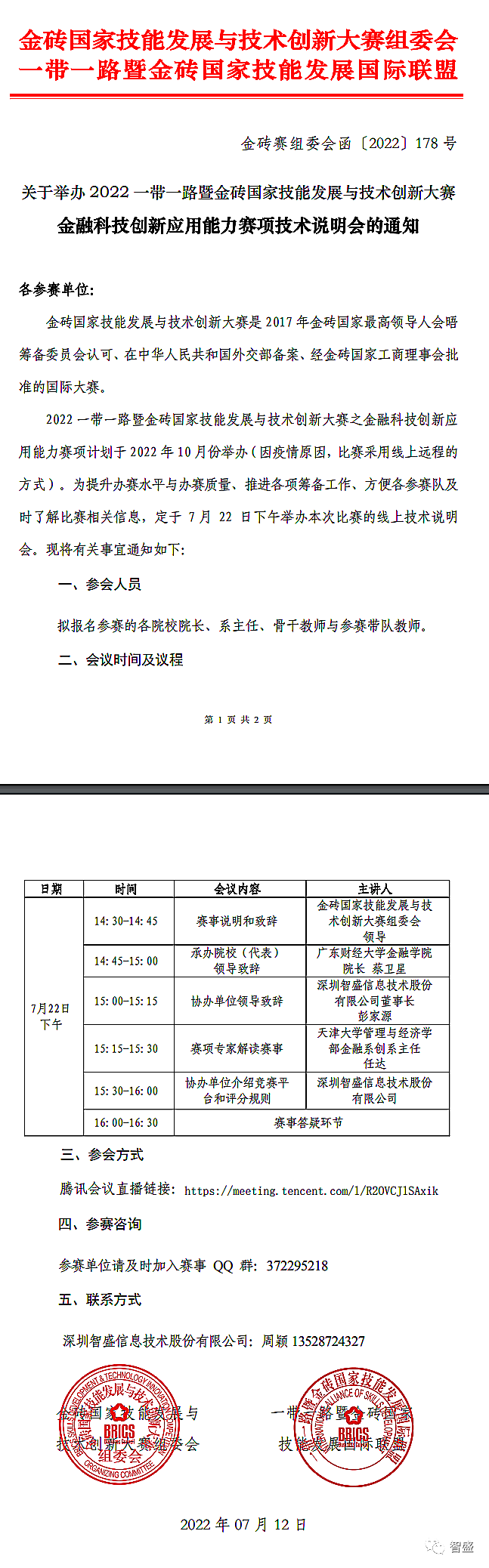 2022一帶一路暨金磚國家技能發(fā)展與技術(shù)創(chuàng)新大賽之金融科技創(chuàng)新應(yīng)用能力賽項(xiàng)計(jì)劃于2022年10月份舉辦(因疫情原因,比賽采用線上遠(yuǎn)程的方式)。為提升辦賽水平與辦賽質(zhì)量、推進(jìn)各項(xiàng)籌備工作、方便各參賽隊(duì)及時(shí)了解比賽相關(guān)信息,定于 7月 22 日下午舉辦本次比賽的線上技術(shù)說明會。現(xiàn)將有關(guān)事宜通知如下: