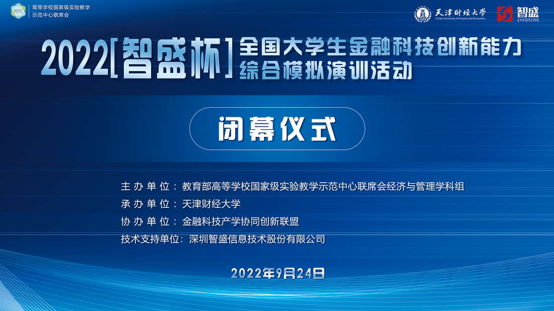2022年9月18日,由教育部高等學(xué)校國家級實驗教學(xué)示范中心聯(lián)席會經(jīng)濟與管理學(xué)科組主辦;天津財經(jīng)大學(xué)承辦;金融科技產(chǎn)學(xué)協(xié)同創(chuàng)新聯(lián)盟協(xié)辦;深圳智盛信息技術(shù)股份有限公司作為技術(shù)支持的2022 年“智盛杯”全國大學(xué)生金融科技創(chuàng)新能力綜合模擬演訓(xùn)活動常規(guī)賽道全國總決賽正式收官。共有來自全國64所本科院校,64支參賽隊伍共256名選手參與角逐!