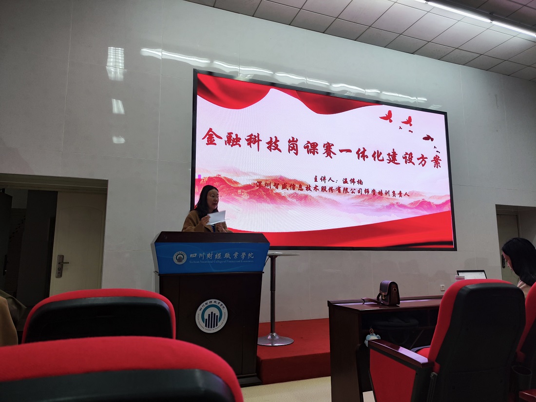 我司(深圳智盛信息技術(shù)股份有限公司)師資培訓(xùn)負(fù)責(zé)人溫偉楠開展金融科技應(yīng)用教學(xué)訓(xùn)創(chuàng)一體化建設(shè)方案講座。講師溫偉楠主要從“銀行業(yè)務(wù)綜合技能賽項(xiàng)的發(fā)展歷程”“金融科技應(yīng)用教學(xué)訓(xùn)創(chuàng)一體化建設(shè)思路”兩個(gè)方面分別做出分享。